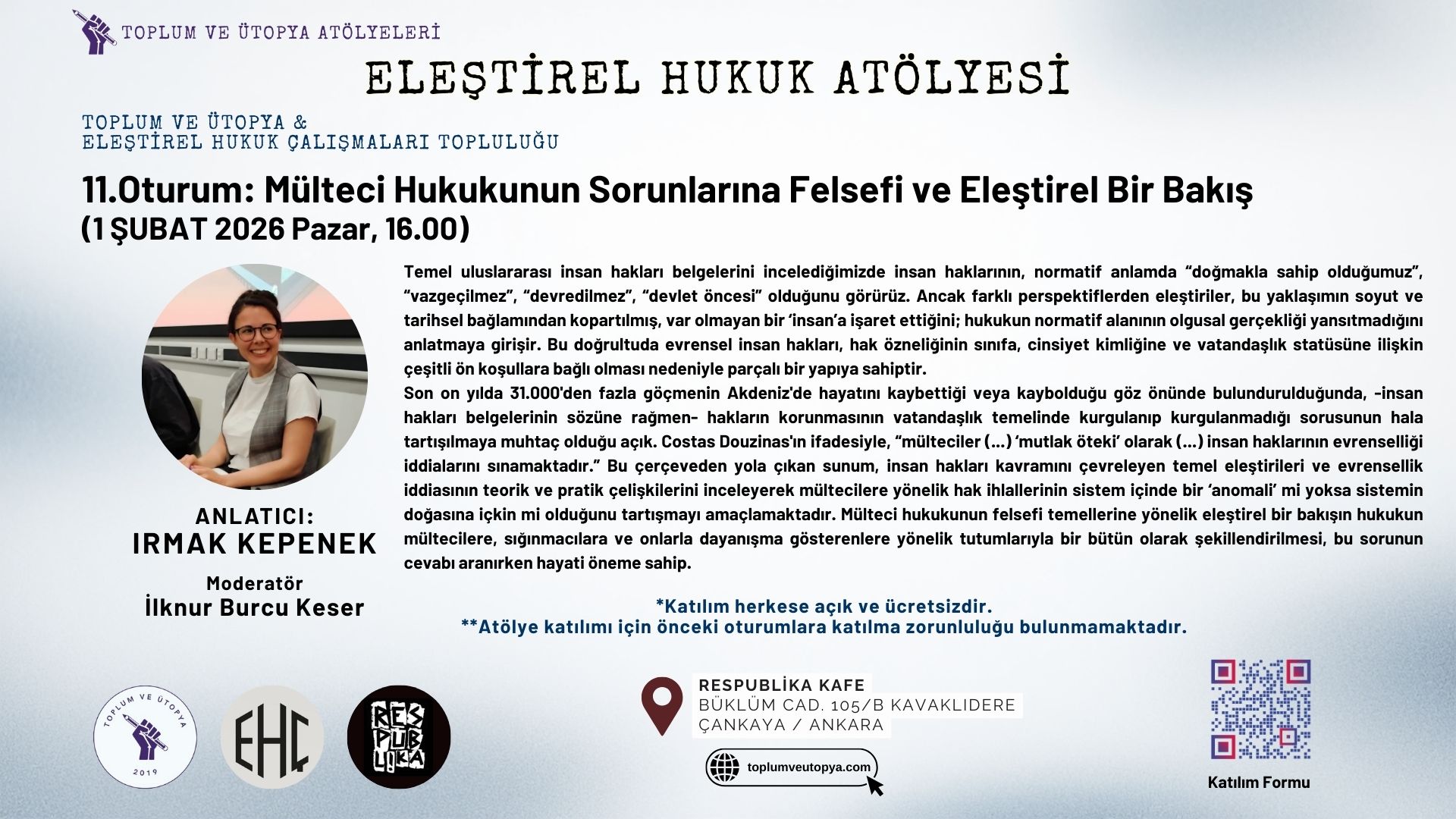 Toplum ve Ütopya ile Eleştirel Hukuk Çalışmaları Topluluğu bünyesinde düzenlenen Eleştirel Hukuk Atölyesi, Ankara’da Respublika Kafe’nin ev sahipliğinde, İlknur Burcu Keser’in moderatörlüğünde 14 oturumdan oluşan bir program olarak yüz yüze gerçekleştirilecektir.…