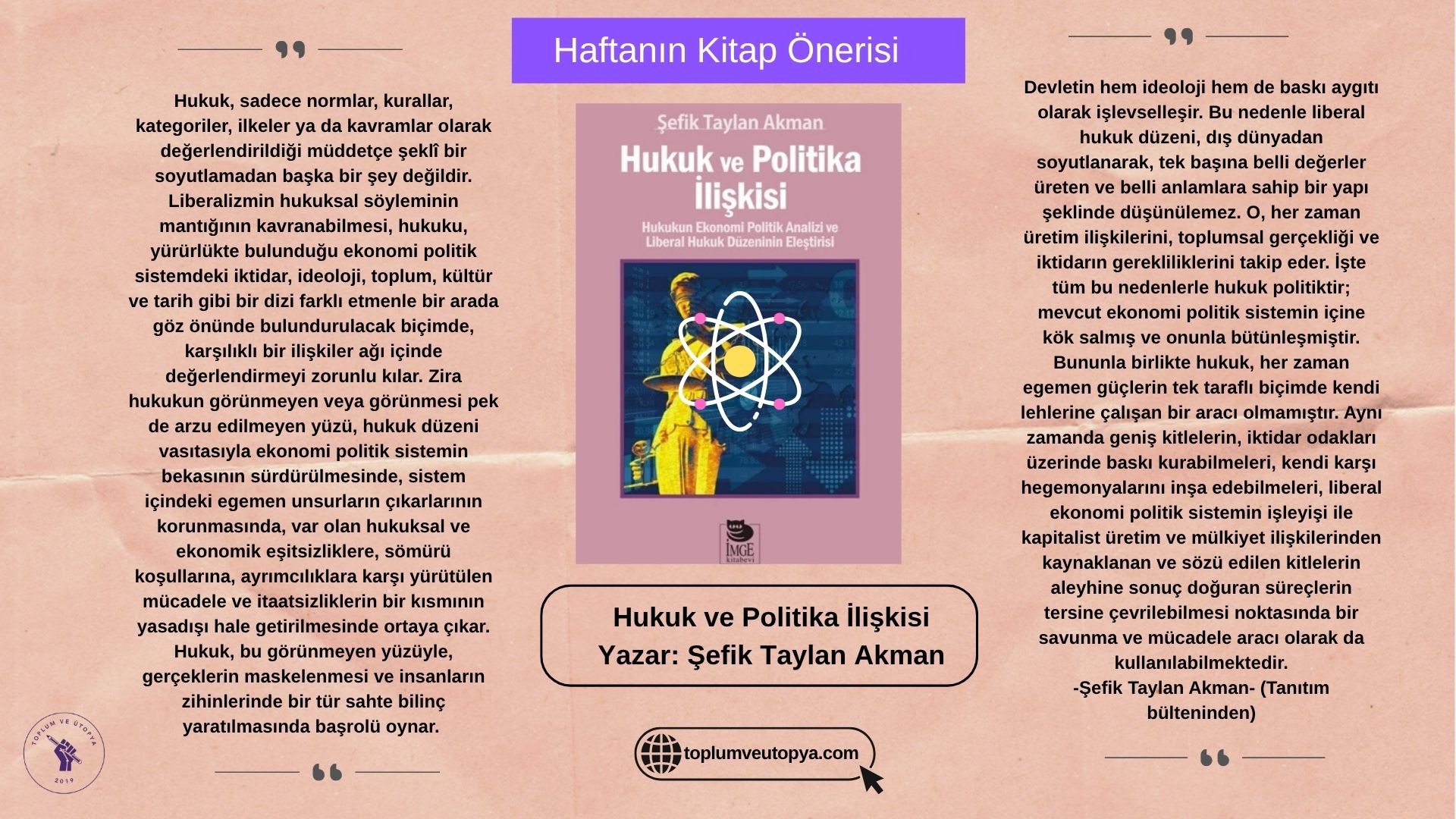 Haftalık kitap önerilerimizde bu haftanın kitabı Şefik Taylan Akman tarafından kaleme alınan “Hukuk ve Politika İlişkisi – Hukukun Ekonomik Analizi ve Liberal Hukuk Düzeninin Eleştirisi” adlı kitap.