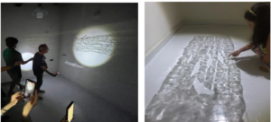 İkinci sanatçımız Melisa Kılıç’tır[13]. Kılıç, çalışmalarını daha çok sürdürülebilirlik bağlamında üretir. Pet şişe plastiklerinden oluşturduğu figürler, ışıkla bir araya geldiklerinde su imgesine dönüşür. Işığın farklı açılardan temasıyla ortaya çıkan bu görüntülerdeki eylemler, canlı yaşamından kesitler sunar. Böylece hem çevresel yıkıma hem de insan-merkezci tüketim pratiklerine eleştirel bir alan açar.