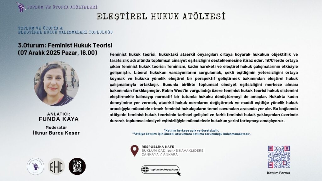 Eleştirel Hukuk Atölyesi 3. Oturum: “Feminist Hukuk Teorisi” – Funda Kaya (07 Aralık 2025)Toplum ve ÜtopyaBugün, 12:47 pm