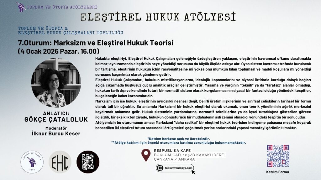 Eleştirel Hukuk Atölyesi 7. Oturum: “Marksizm ve Eleştirel Hukuk Teorisi” – Gökçe Çataloluk (4 Ocak 2026)Toplum ve Ütopya1 Oca, 10:51 am