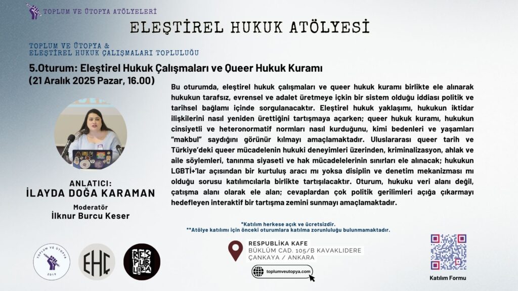 Eleştirel Hukuk Atölyesi 5. Oturum: “Eleştirel Hukuk Çalışmaları ve Queer Hukuk Kuram” – İlayda Doğa Karaman (21 Aralık 2025)Toplum ve ÜtopyaAralık 17, 2025